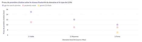 Par ailleurs, la provenance des sources, et plus particulièrement le niveau d’autorité des  domaines, exerce un impact significatif sur la rapidité de citation. Plus une source provient d’un  domaine à forte autorité, plus elle est prise en compte rapidement, et ce quelle que soit la  famille de LLMs considérée.