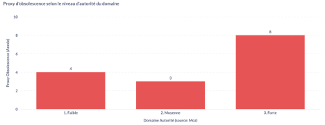 Comme pour le proxy de première citation, nous avons utilisé la même méthodologie et avons  réitéré le calcul du proxy d’obsolescence, en le déclinant cette fois selon différentes tranches  d’autorité de domaine.