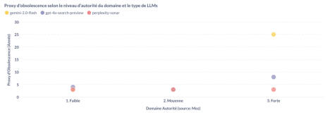 – En revanche, les écarts sont beaucoup plus marqués pour les domaines à forte autorité:  Gemini 2.0 Flash à une valeur de proxy de vingt-cinq ans, ChatGPT de huit ans, alors  que celle de Perplexity est de trois ans.